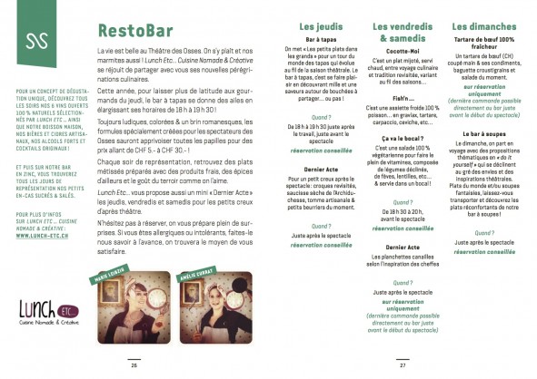 Pour la troisième année consécutive, Lunch Etc …, Cuisine Nomade & Créative officie avec gourmandise et toujours autant de plaisir dans les cuisines du théâtre. Ludiques, colorées, un brin romanesques, les formules spécialement créées pour les spectateurs du Théâtre des Osses, sauront apprivoiser toutes les papilles pour des prix allant de CHF 5.- à CHF 30.- !